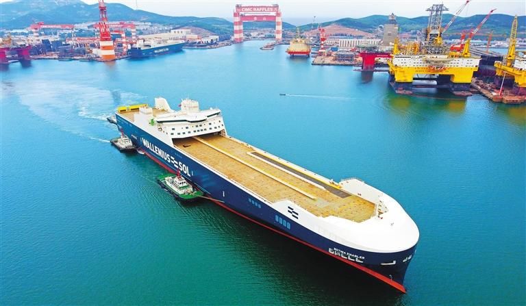由中集来福士海洋工程有限公司为瑞典设计建造的全球最大的双燃料冰级滚装船在山东省烟台市交付并起航。今年1月份至6月份,我国造船完工量、新接订单量、手持订单量,国际市场份额均居世界第一。唐 克摄(中经视觉)