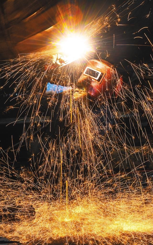 位于浙江省温岭市松门镇礁山港的浙江腾龙造船有限公司,工人在焊接船舶主体,赶制生产订单。刘振清摄(中经视觉)