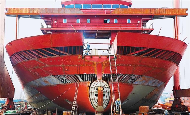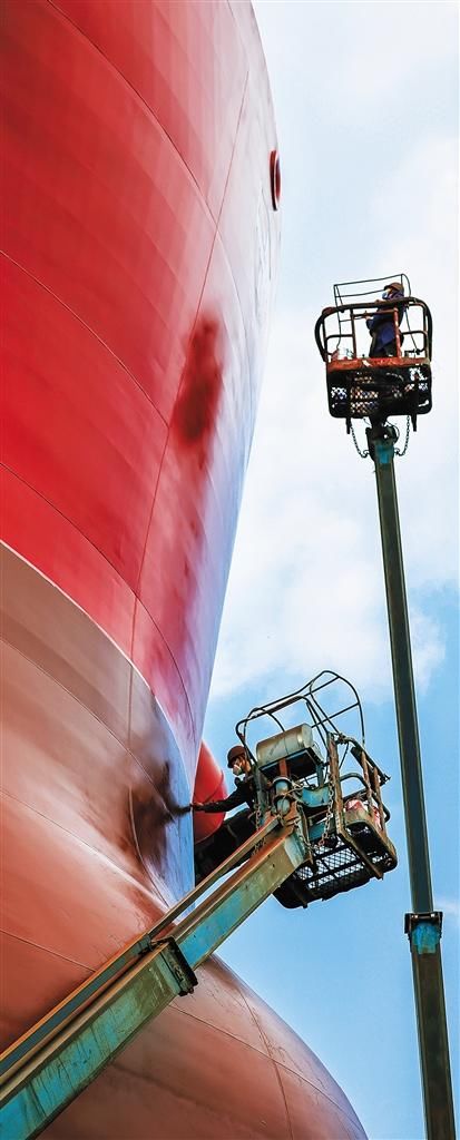 广东中远海运重工员工在为巨轮涂装。今年上半年,该公司订单充足,新船型研发和交付快速推进。付海燕摄(中经视觉)
